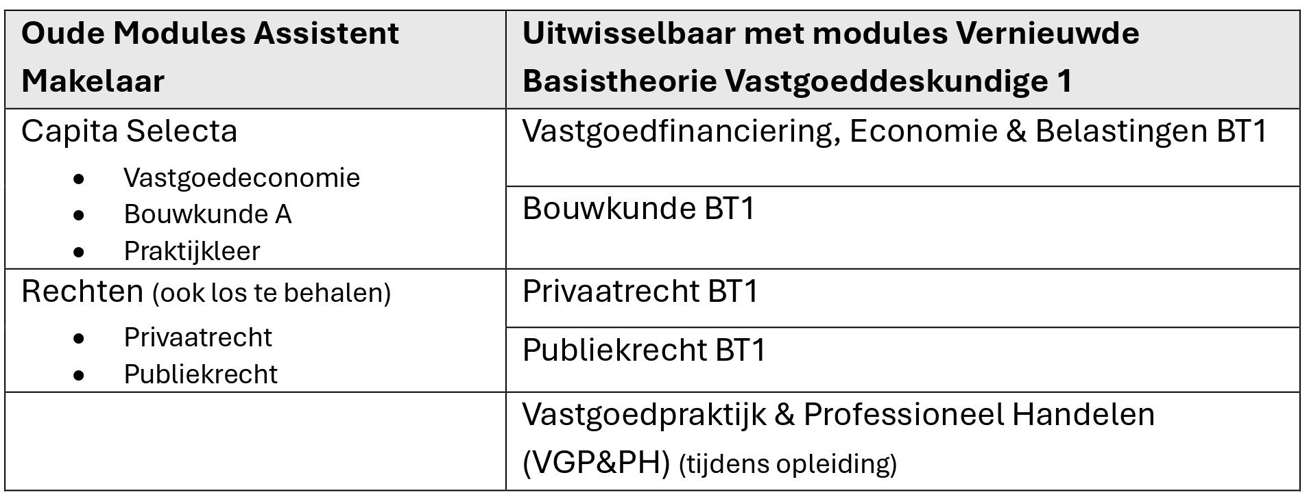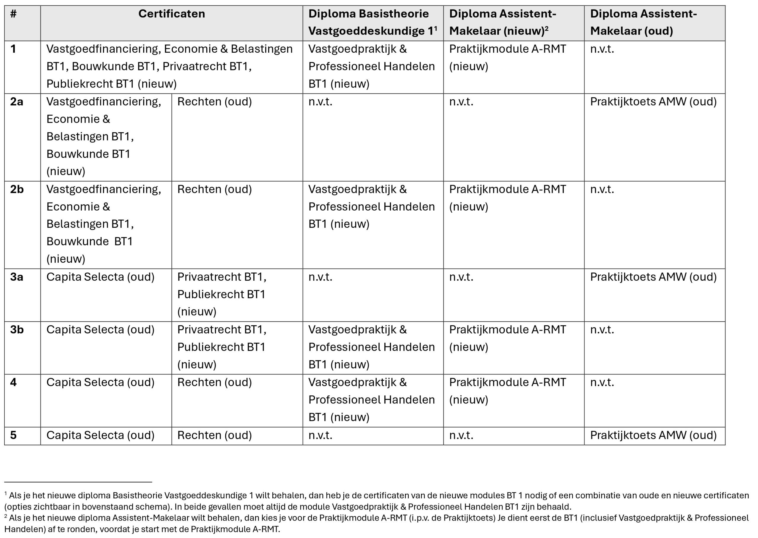 Het diploma Basistheorie Vastgoeddeskundige BT1 kan worden verkregen op basis van een combinatie van oude en nieuwe certificaten. In het onderstaande overzicht is de uitwisselbaarheid van de diverse certificaten weergegeven.