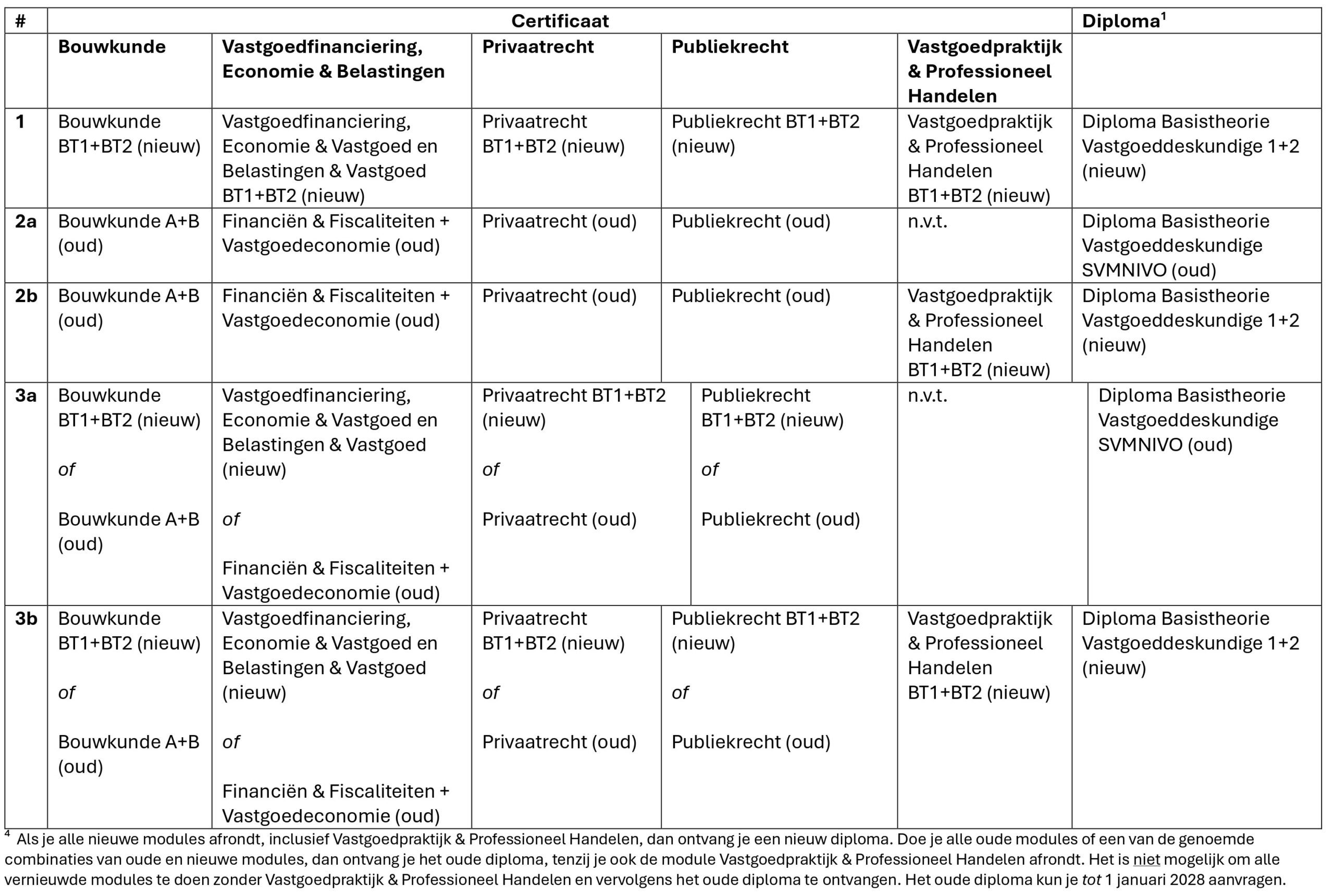 Tot 1 januari 2028 kan het oude diploma, op basis van een combinatie van oude en nieuwe certificaten, zonder de nieuwe module Vastgoedpraktijk en Professioneel Handelen, worden verkregen.