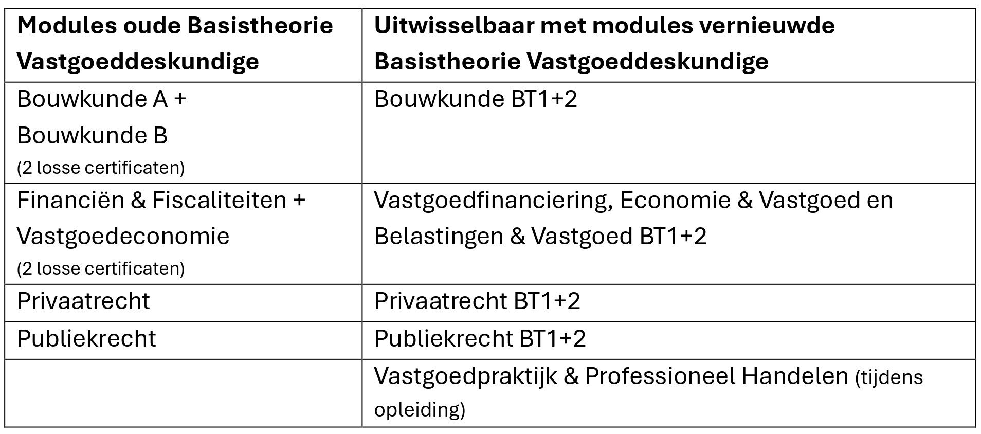 - Tot 1 januari 2028 kan het oude diploma, op basis van alleen oude of een combinatie van oude en nieuwe certificaten, zonder de nieuwe module Vastgoedpraktijk en Professioneel Handelen, worden verkregen.